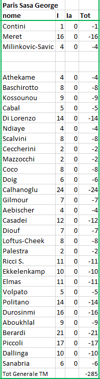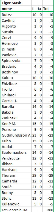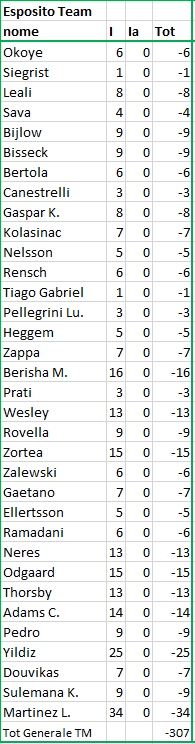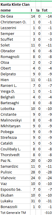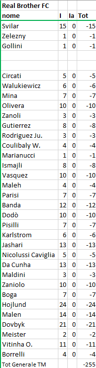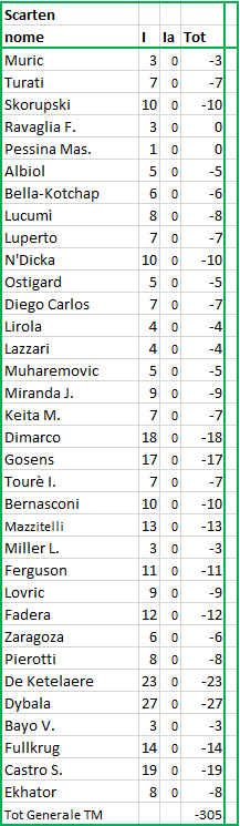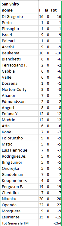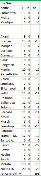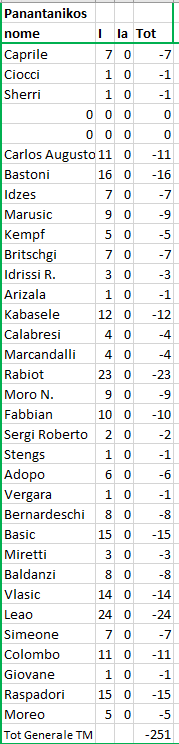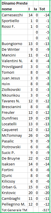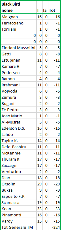 quotazione iniziale al momento dell'acquisto; F = quotazione finale alla fine del Campionato; Tot = differenza tra I e F (effettivo incremento / decremento) |